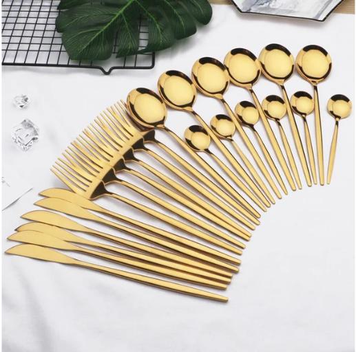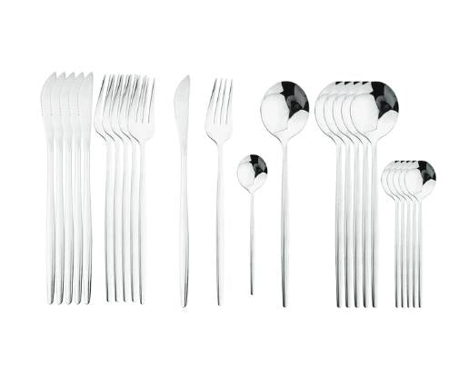 Dieses vollständige Set besteht aus 24 sorgfältig ausgewählten Teilen für ein hochwertiges Esserlebnis. Enthalten sind 6 Messer mit hochwertiger Edelstahlklinge und ergonomischem Griff für präzises Schneiden, 6 Gabeln mit fein gearbeiteten Zinken, 6 Löffel in idealer Größe für Suppen und Schalen sowie 6 Teelöffel für den stilvollen Genuss von Kaffee oder Tee.