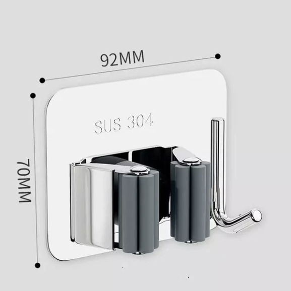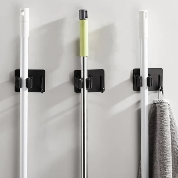 Dank seiner flexiblen Halterungen passt der Halter an Stiele unterschiedlicher Größen. Durch das clevere Design verfügt er zusätzlich über Haken, an denen Sie Tücher, Schwämme oder Reinigungshandschuhe aufhängen können.